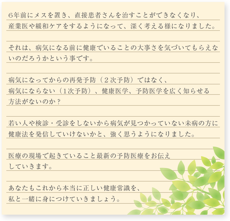 医学博士。金沢大学付属病院第1外科関連病院を経て、宮崎県延岡市